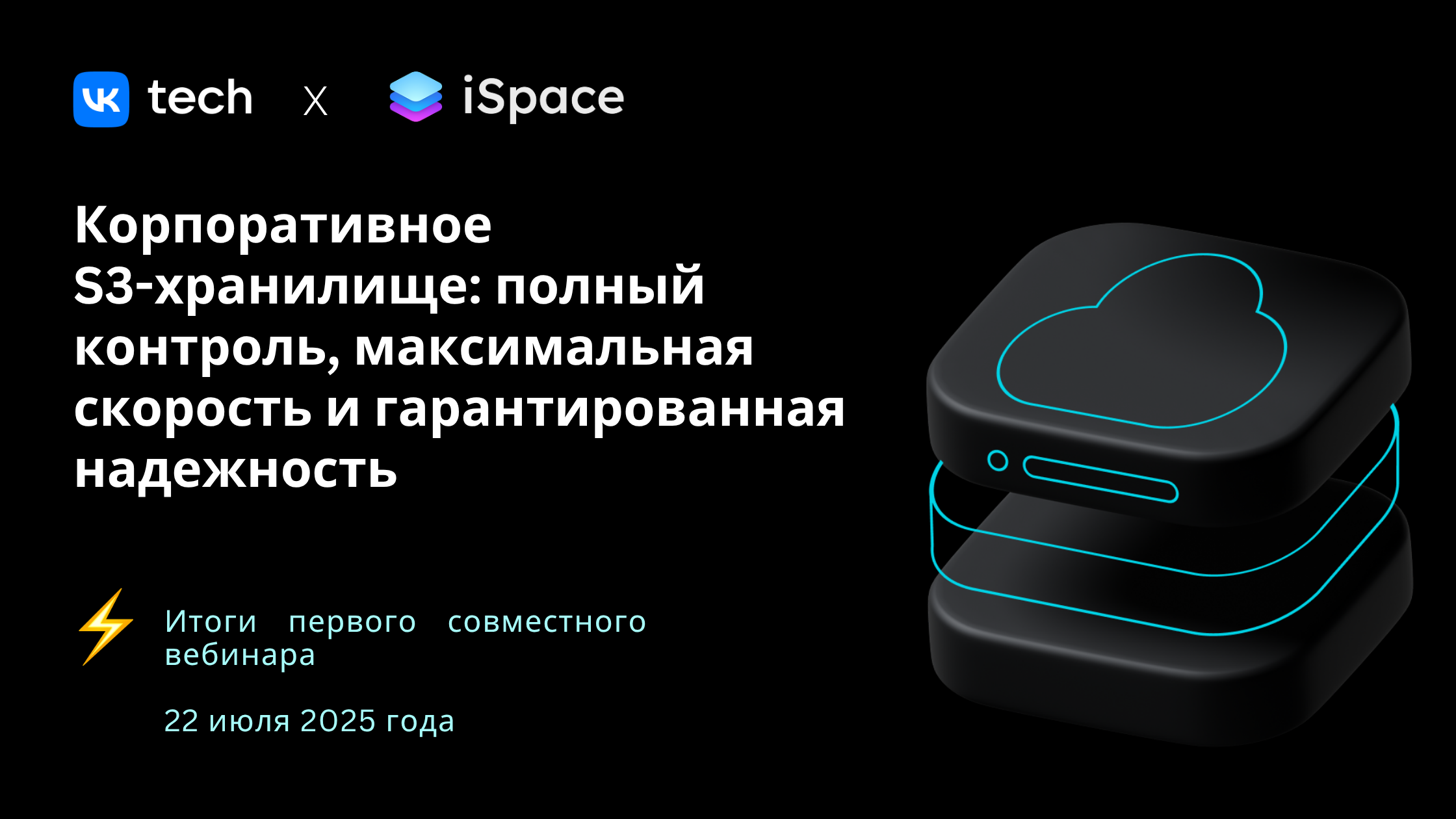 22 июля 2025 года состоялся первый совместный вебинар, организованный командой iSpace и нашим партнёром VK Tech, посвящённый корпоративному S3-хранилищу и возможностям его применения в различных сценариях. В фокусе обсуждения было создание удобной, надежной и безопасной инфраструктуры хранения данных с помощью VK Object Storage и расширение спектра доступных сценариев использования хранилища при использовании совместно с платформой iSpace.