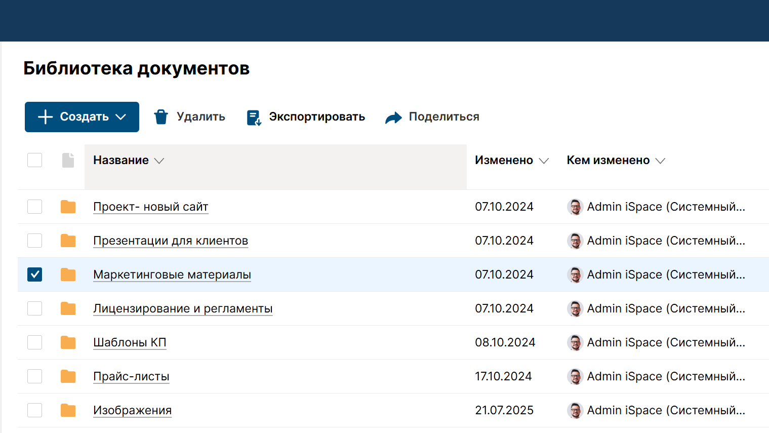 Внутри библиотек находятся привычные всем папки и подпапки, которые мы можем создавать, удалять, размещать в них файлы. Перемещать и копировать их между папками, выдавать права, делиться.